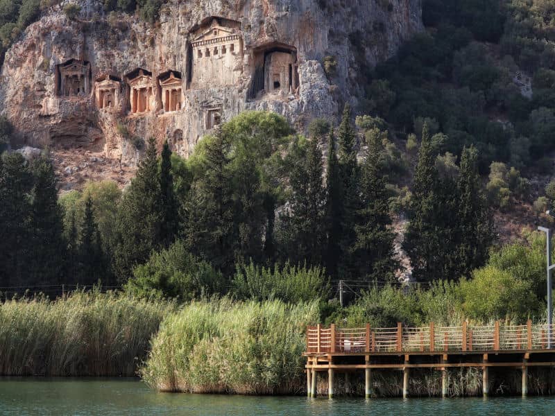 Dalyan Tour One of the most relaxing and scenic days out in this area.After a short coach journey your day is spent on a boat meandering down the river delta.starting at Dalyan ,a small fishing harbour you will pass an road to the sea the ancient lycian rock tombs which have been hewn out of the cliff.